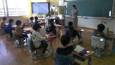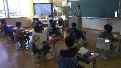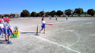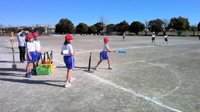 1年生は国語の学習「てがみで しらせよう」の本文の読み取りを、3年生は体育の学習「ティーボール」の中で、ボールを力強く打つ練習に取り組んでいました。